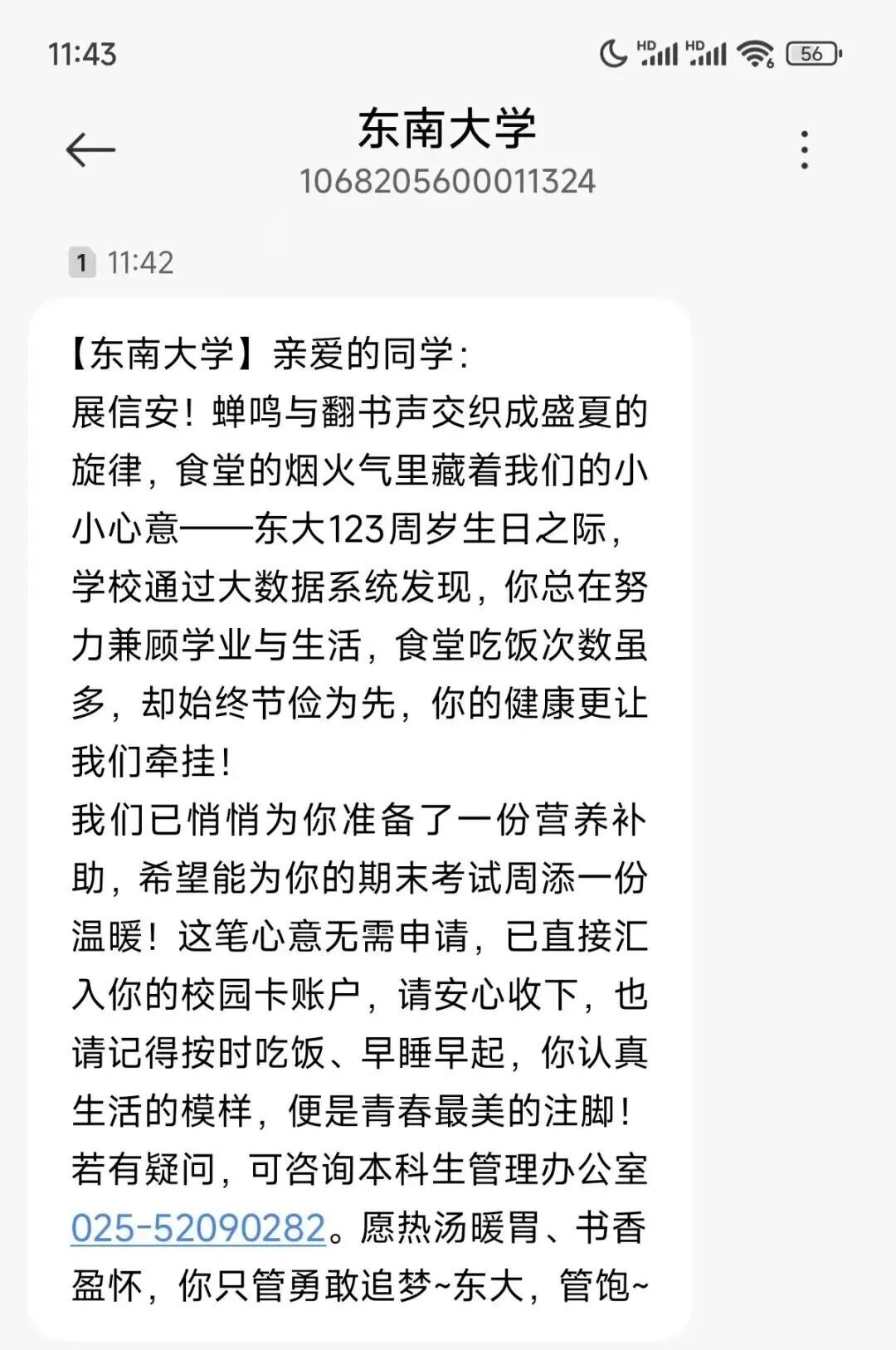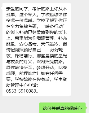 近日,安徽師范大學(xué)為793名考研家庭經(jīng)濟(jì)困難學(xué)子發(fā)放補(bǔ)助,悄悄將生活補(bǔ)助打入飯卡,留言“為你增添營養(yǎng),補(bǔ)充能量,安心備考”。這份突如其來的溫暖,讓備考的同學(xué)們?cè)诤斜陡形拷濉?/p>