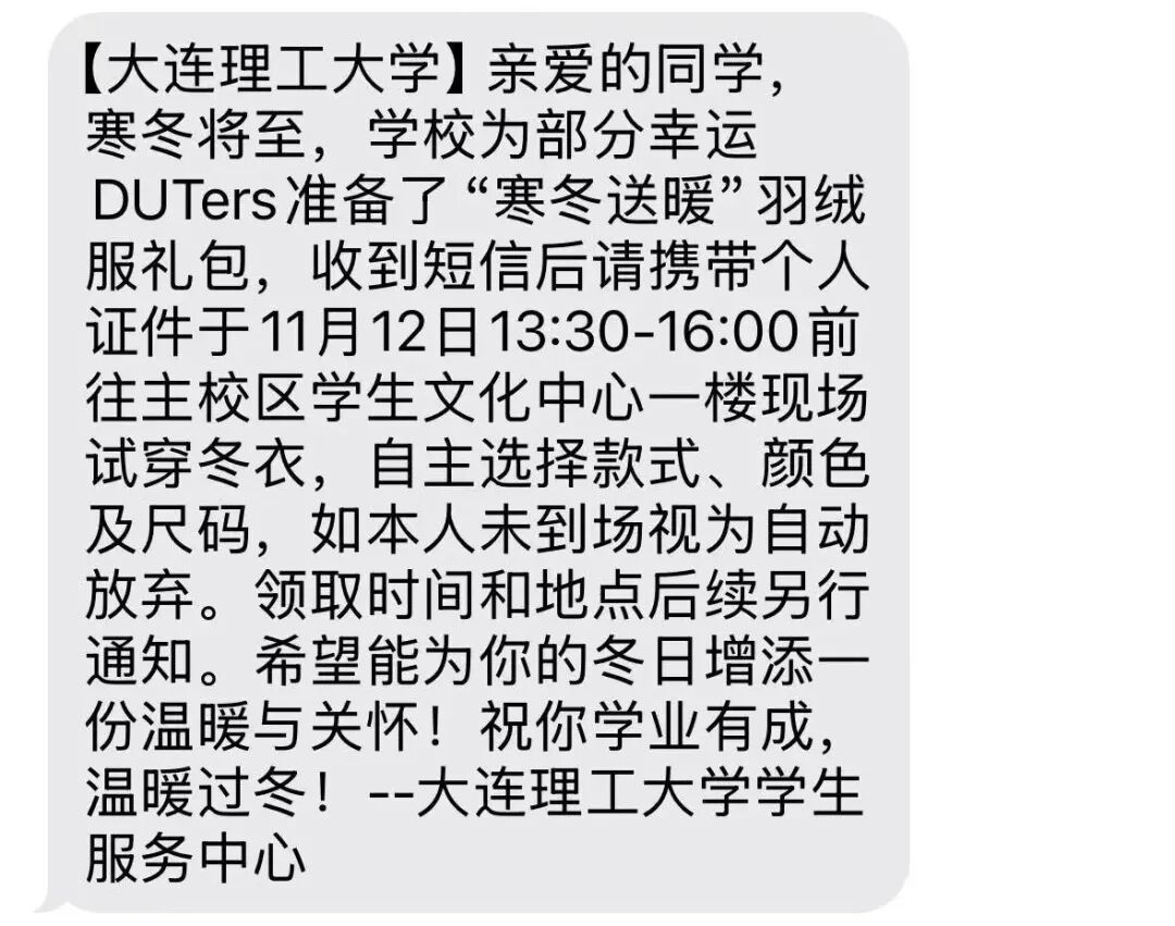 大連理工大學(xué)堅(jiān)持17年為家庭困難學(xué)生送上保暖冬衣,采用“免申即領(lǐng)”的主動(dòng)送達(dá)方式,學(xué)生通過短信受邀自主挑選顏色與樣式,以“去標(biāo)簽化”尊重學(xué)生隱私。