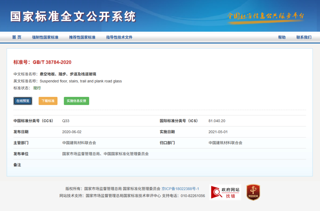 2021年5月1日起,國(guó)家標(biāo)準(zhǔn)GB/T 38784-2020《懸空地板、踏步、步道及棧道玻璃》正式實(shí)施,該標(biāo)準(zhǔn)明確了懸空類(lèi)玻璃產(chǎn)品的術(shù)語(yǔ)定義、分類(lèi)、材料要求、試驗(yàn)方法、檢驗(yàn)規(guī)則以及包裝運(yùn)輸?shù)葍?nèi)容。