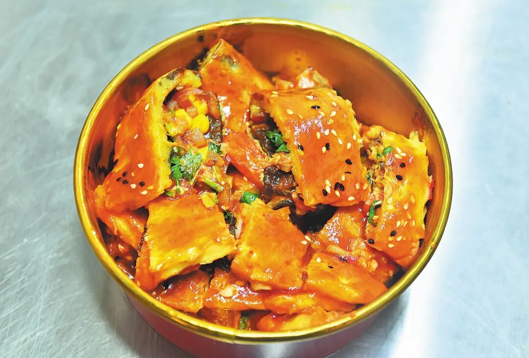 夜市小吃既有本地特色,又融各地風味?!扒鼗蕧u烤冷面”便是代表——它將東北烤冷面與本地食材結合,成了夜市名片:酥脆面皮裹著小龍蝦尾、蟹棒,刷上特制醬料,咸鮮微辣在口中迸發(fā),讓人回味無窮。