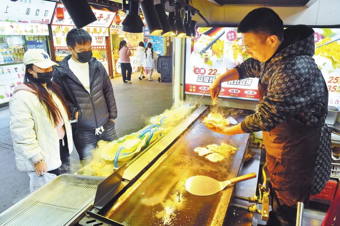 剛出鍋的“秦皇島烤冷面”色澤誘人,熱氣裹著香氣,是夜市里最受歡迎的美味之一。