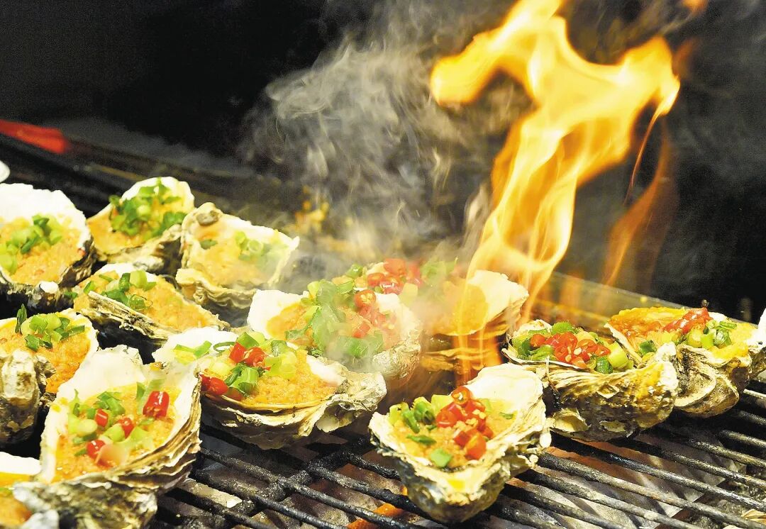 蒜香撲鼻的烤生蠔即將出爐,蒜蓉與蠔肉的搭配,是海濱夜市最經典的味道。