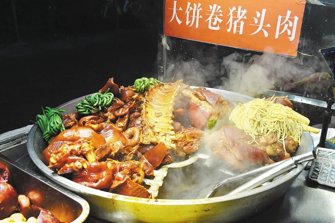 泰山路夜市的鹵菜攤位上,醬色濃郁的鹵味整齊碼放,種類繁多引人駐足。