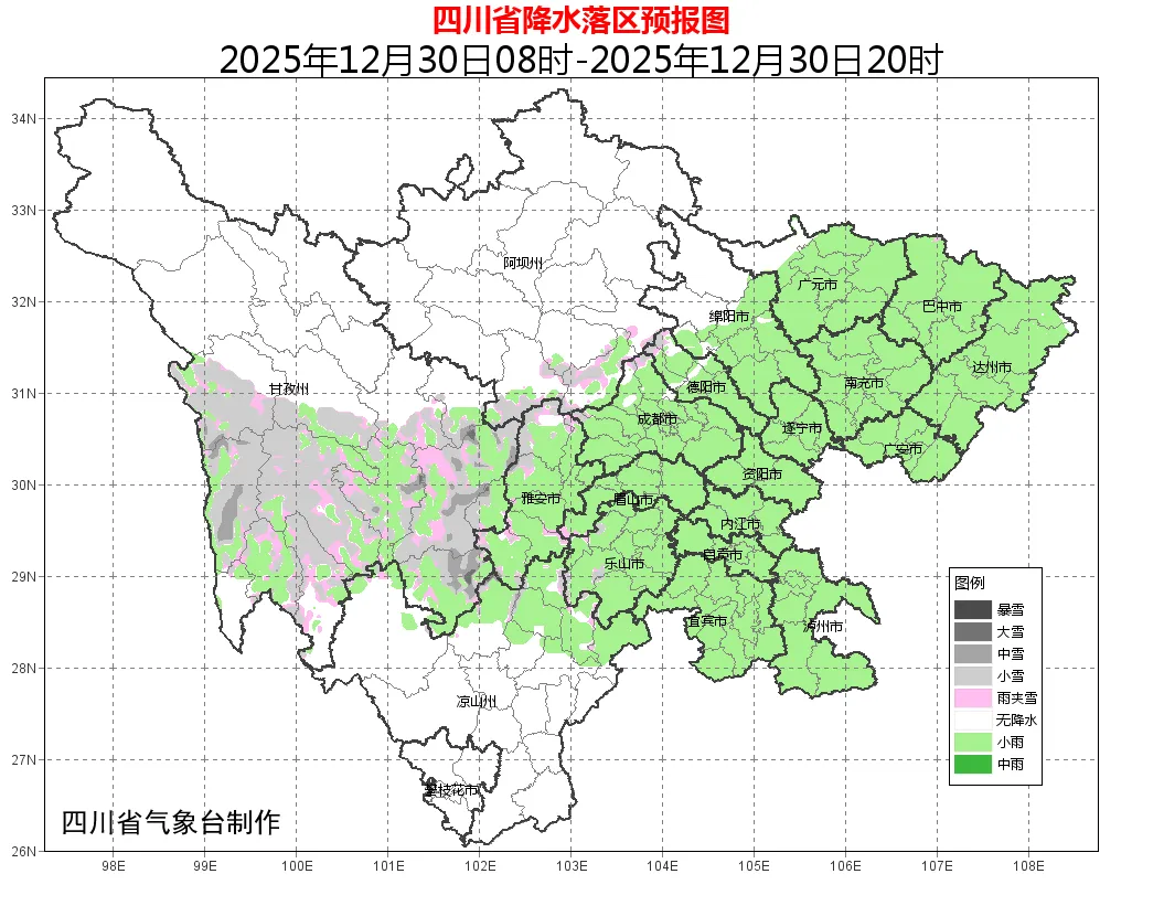 未來幾天,四川大部分地區(qū)將進(jìn)入雨雪頻繁的天氣模式。四川省氣象臺預(yù)計(jì),30日,四川盆地各市陰天有小雨,其中達(dá)州、巴中、南充、廣安、遂寧、資陽、瀘州7市以及廣元、內(nèi)江2市東部有中雨,高海拔山區(qū)有雨夾雪或小雪;甘孜州中部南部、阿壩州東部南部和涼山州北部陰天間多云,有陣雪(雨),局部地區(qū)有中到大雪,川西高原和攀西其他地區(qū)多云轉(zhuǎn)晴。