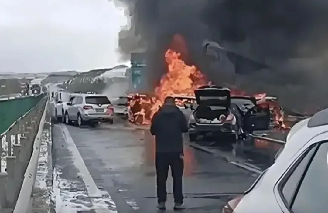 -2- 2024年10月1日,內(nèi)蒙古高速因降雪路面濕滑,一輛半掛貨車失控橫路,后續(xù)多輛轎車發(fā)生事故并起火。