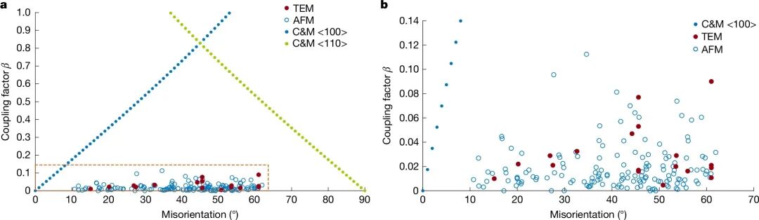 1.原子力顯微鏡方法可獲得更大量的β統(tǒng)計數(shù)據(jù),與原位透射電鏡結(jié)果一致:首先,β因子不依賴于晶界取向差,同一晶界在遷移過程中β值可能變化,這與“β并非晶界本征屬性”的模擬結(jié)論相符。而傳統(tǒng)理論認(rèn)為β因子直接取決于晶界取向差,其預(yù)測的β模量在圖4中以藍(lán)綠色實心圓盤表示。其次,無論晶界類型與取向差如何,β因子始終維持在較低水平,透射電鏡測量的平均β值約為0.03,若僅考慮傾轉(zhuǎn)分量,平均值約為0.08。