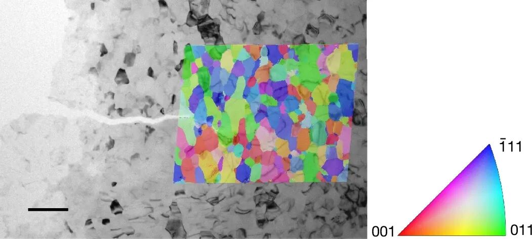 圖1| 預(yù)裂紋超細(xì)晶鋁薄片的明場透射電鏡顯微圖像與晶體取向圖疊加結(jié)果