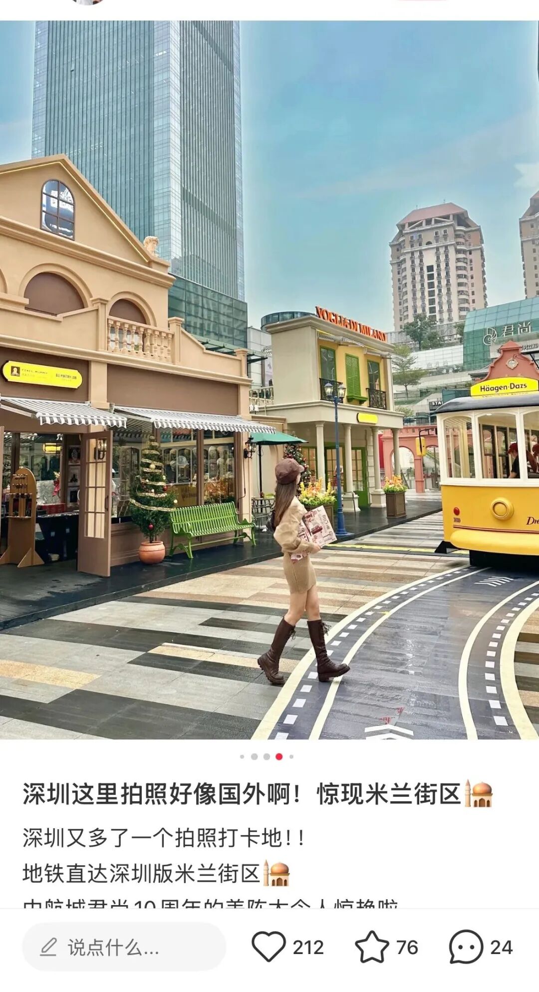 “深圳版‘米蘭小鎮(zhèn)’直接美到我心里了,隨手一拍都有故事感,出片率特別高,朋友圈九宮格都不夠放?!敝苣?,家住福田的阿鈴和閨蜜在華強(qiáng)北聚餐后,就扎進(jìn)中航城君尚購物中心的“假日70幀”主題街區(qū)瘋狂拍照。她告訴記者,自己在社交平臺上看到這個主題街區(qū),特意拉著朋友來打卡,“體驗很棒,我們拍完照還能逛逛商場,再約個下午茶、曬曬太陽,很愜意放松?!?/p>