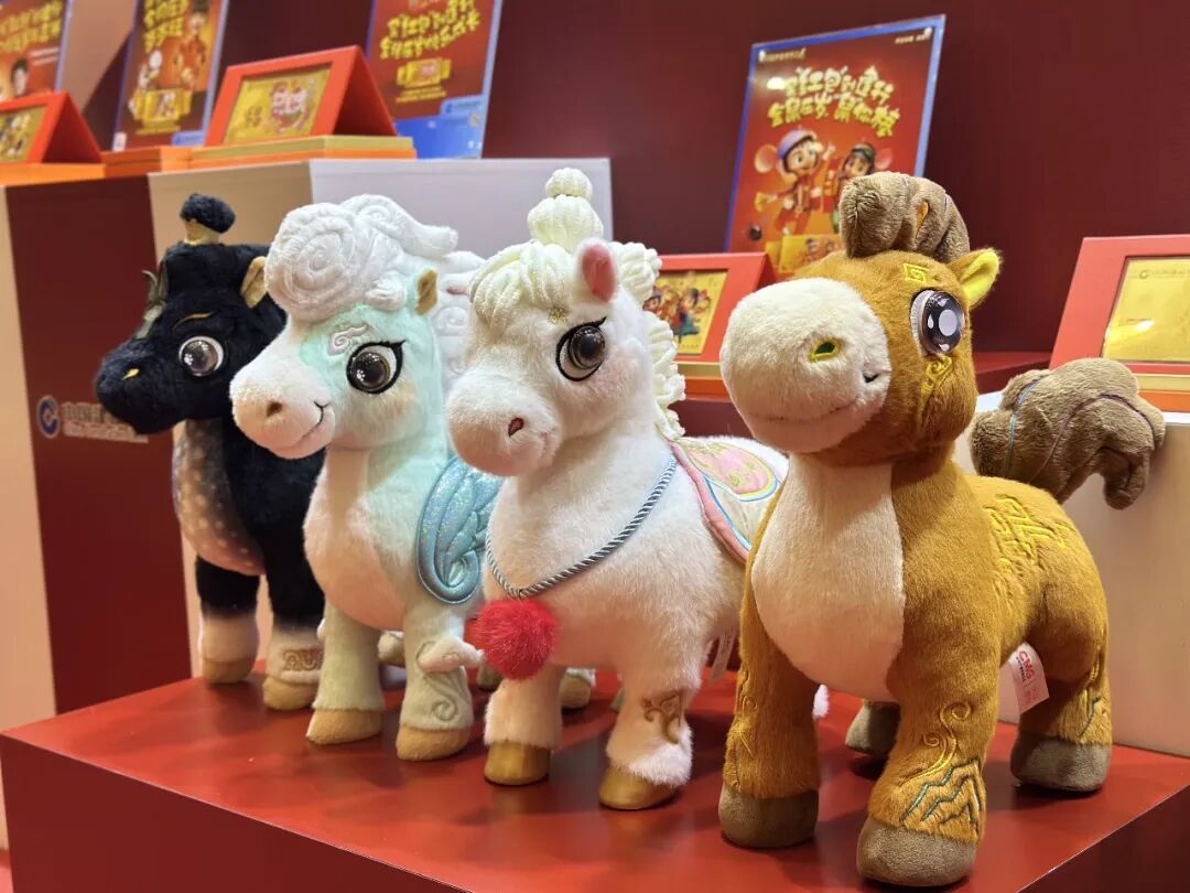 記者昨天在現(xiàn)場看到,以“騏驥馳騁”四大吉祥物為原型打造的超大旋轉(zhuǎn)木馬藝術(shù)裝置,把現(xiàn)場氛圍拉得滿滿的,總臺文創(chuàng)的新春好禮、馬年限定衍生品都集體展示出來,有“春碗”“春盤”等精美的瓷器,還有可愛的吉祥物等文創(chuàng)商品。
