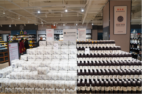 為滿足消費(fèi)者對(duì)高性價(jià)比品牌商品的需求,門店專門設(shè)立胖東來(lái)自有品牌專區(qū),引入DL啤酒、自由·愛白酒、DL果汁、DL燕麥片等70余款熱門商品。同時(shí),永輝自有品牌如品質(zhì)永輝橙汁、洗衣液、醬油等多款商品,以高性價(jià)比滿足家庭核心需求。