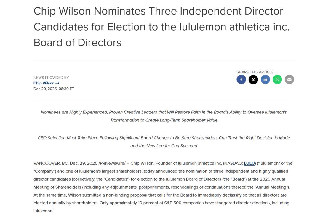 威爾遜于周一發(fā)布聲明,宣布提名3名董事候選人參與露露樂蒙董事會(huì)席位競選。