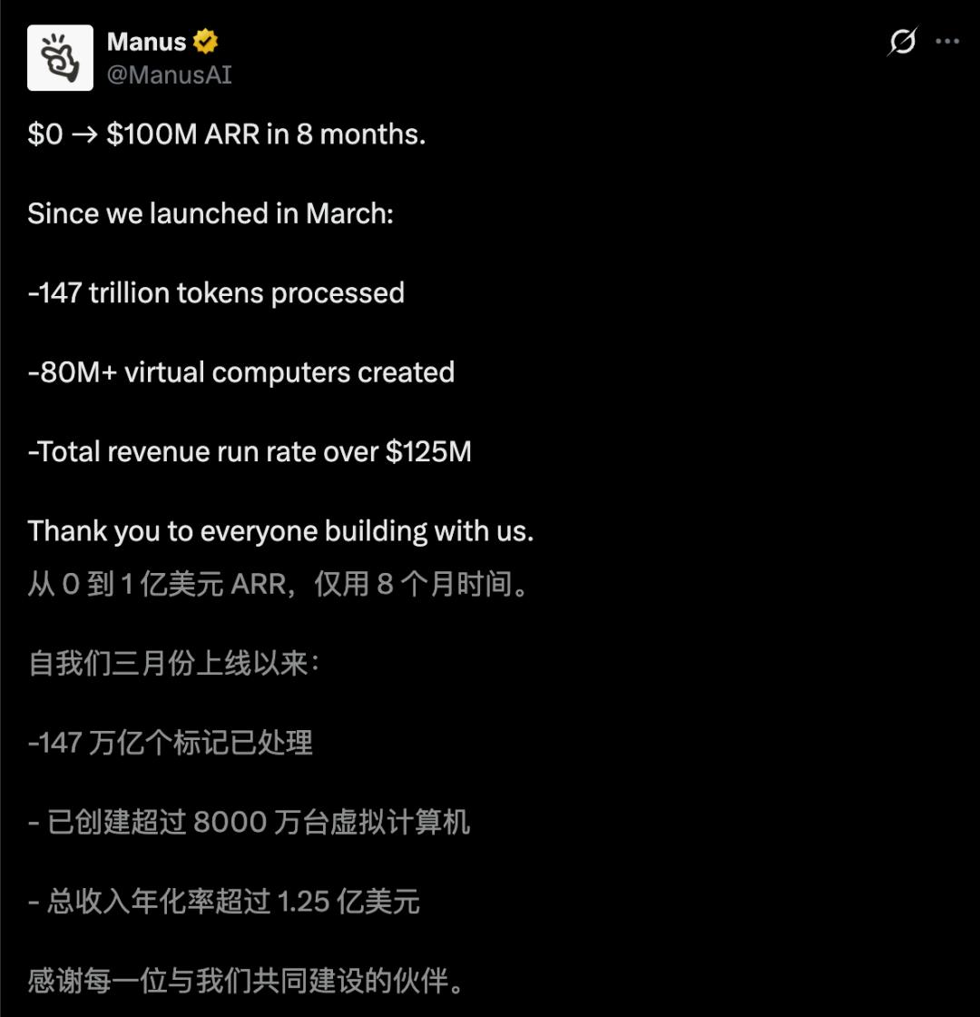 就在本月,Manus公布了過去一年的成績,僅用8個月時間,年化營收(ARR)就從0增長到1億美元。