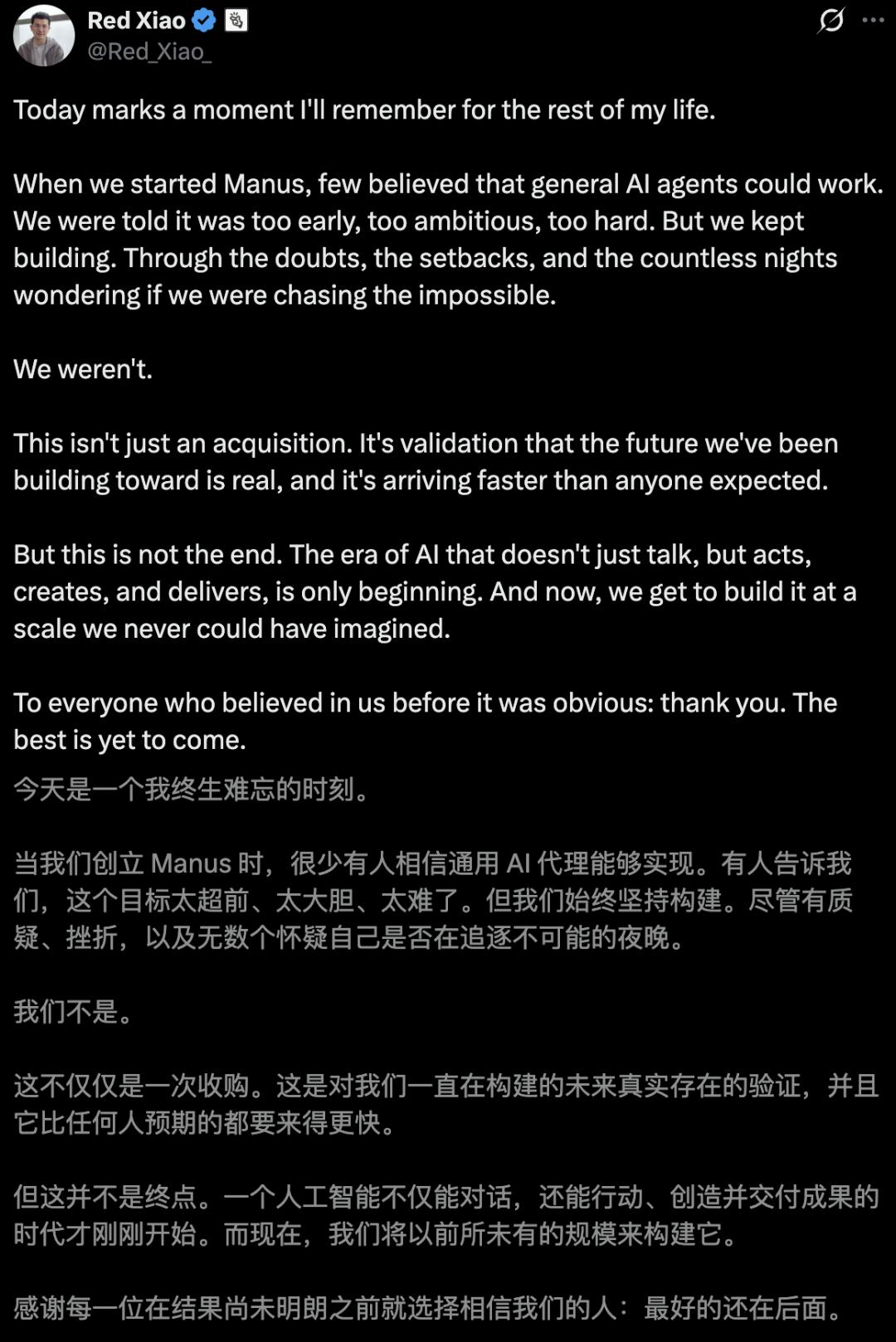 Manus創(chuàng)始人兼CEO肖弘感慨道:「今天,是我一生都難以忘懷的時刻」。
