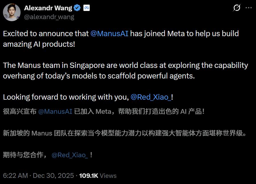 就在剛剛,Meta正式宣布收購AI智能體初創(chuàng)公司Manus,創(chuàng)始人肖弘直接擔任Meta副總裁!