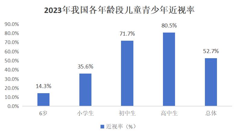 2023年國家衛(wèi)健委的數(shù)據(jù)顯示,我國兒童青少年總體近視率為52.7%,其中6歲兒童14.3%,小學(xué)生35.6%,初中生71.7%,高中生80.5%。