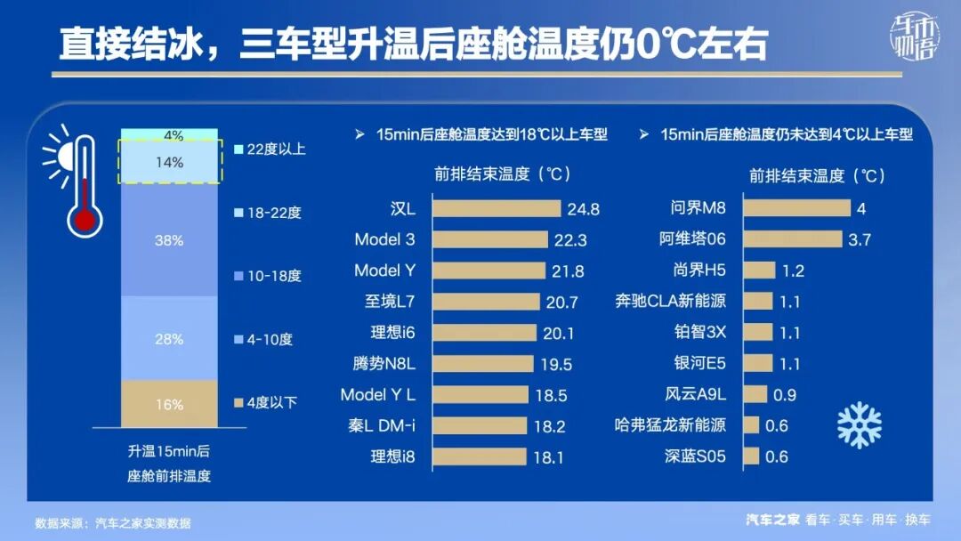 空調(diào)效率高,才能兼顧保暖與續(xù)航;若空調(diào)持續(xù)運(yùn)行卻效果不佳,會(huì)造成大量能耗浪費(fèi)。此次汽車之家開展了空調(diào)升溫測試,在嚴(yán)寒環(huán)境(-22~-16℃)下,空調(diào)開啟最強(qiáng)制熱模式15分鐘后,僅14%的被測車型前排溫度達(dá)到人體舒適的18-22℃,4%的車型溫度超22℃,這一結(jié)果尚可接受。