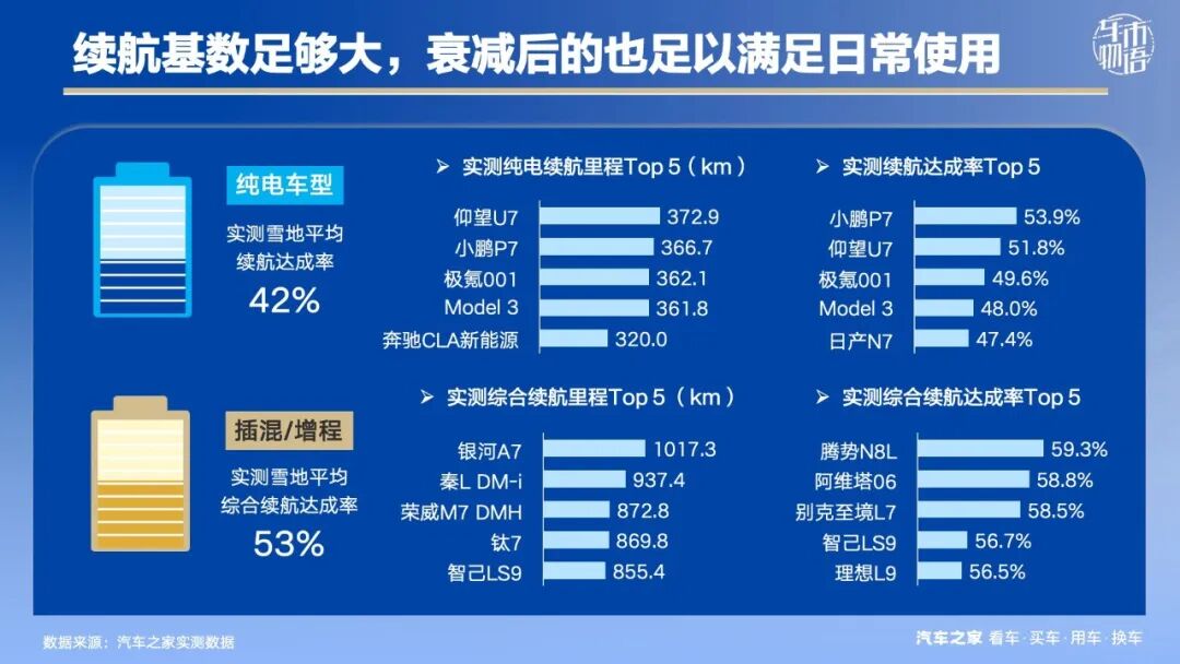 今年熱門新能源車的綜合可靠性進(jìn)步明顯,在嚴(yán)苛的嚴(yán)寒高速雪地測試環(huán)境下,純電續(xù)航達(dá)成率最高達(dá)54%,十分難得。