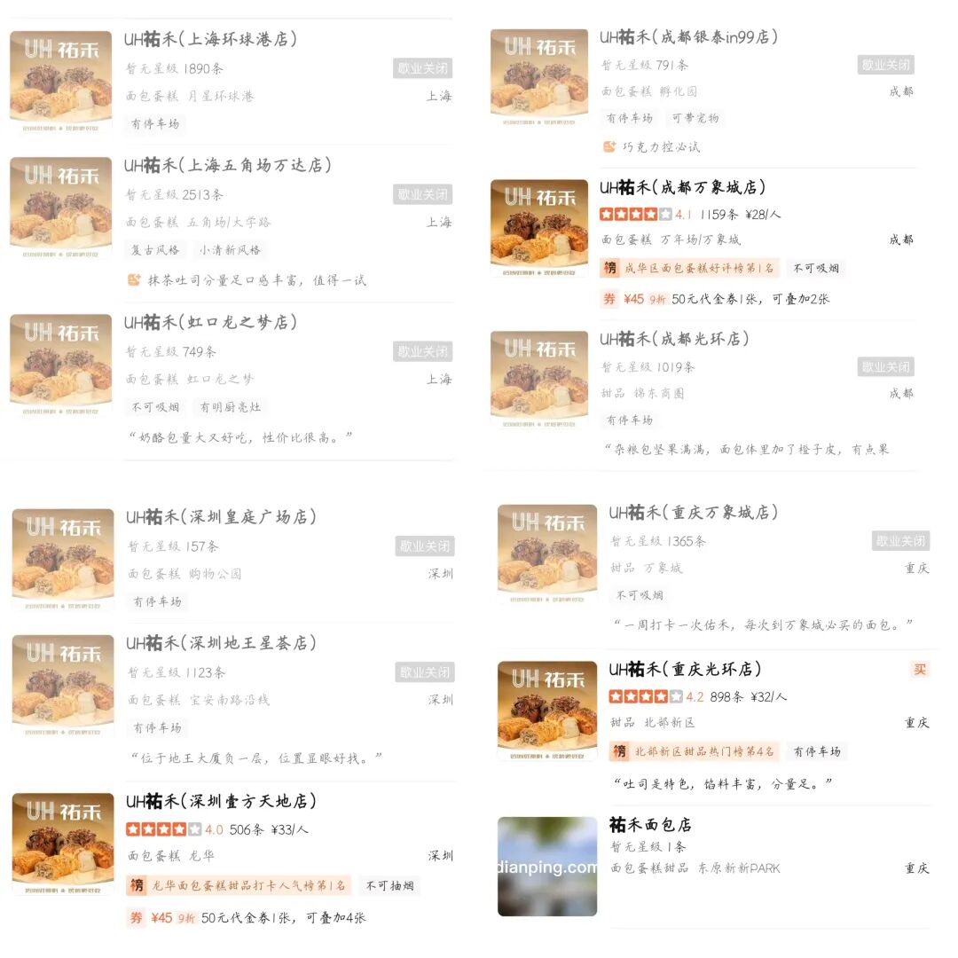 值得注意的是,祐禾在上述城市仍有門店運營,并未完全撤出。以上海為例,關閉三家門店后,仍有12家正常營業(yè)。