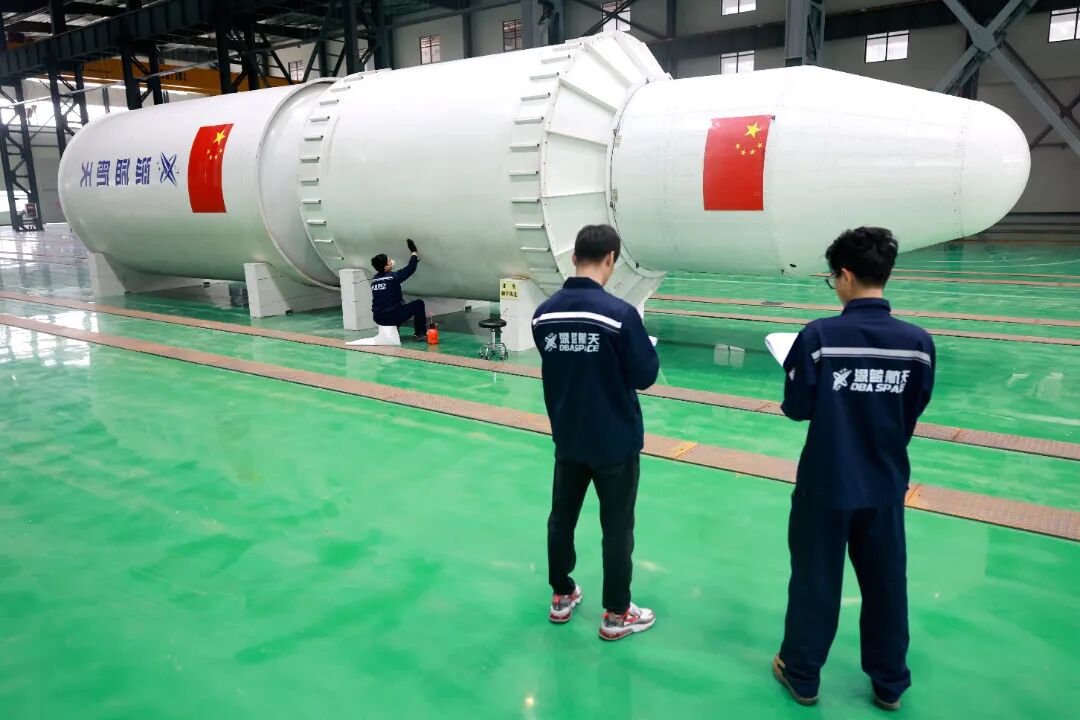 ▲深藍太空航天科技(蚌埠)有限公司工作人員正在進行火箭總裝預(yù)處理。