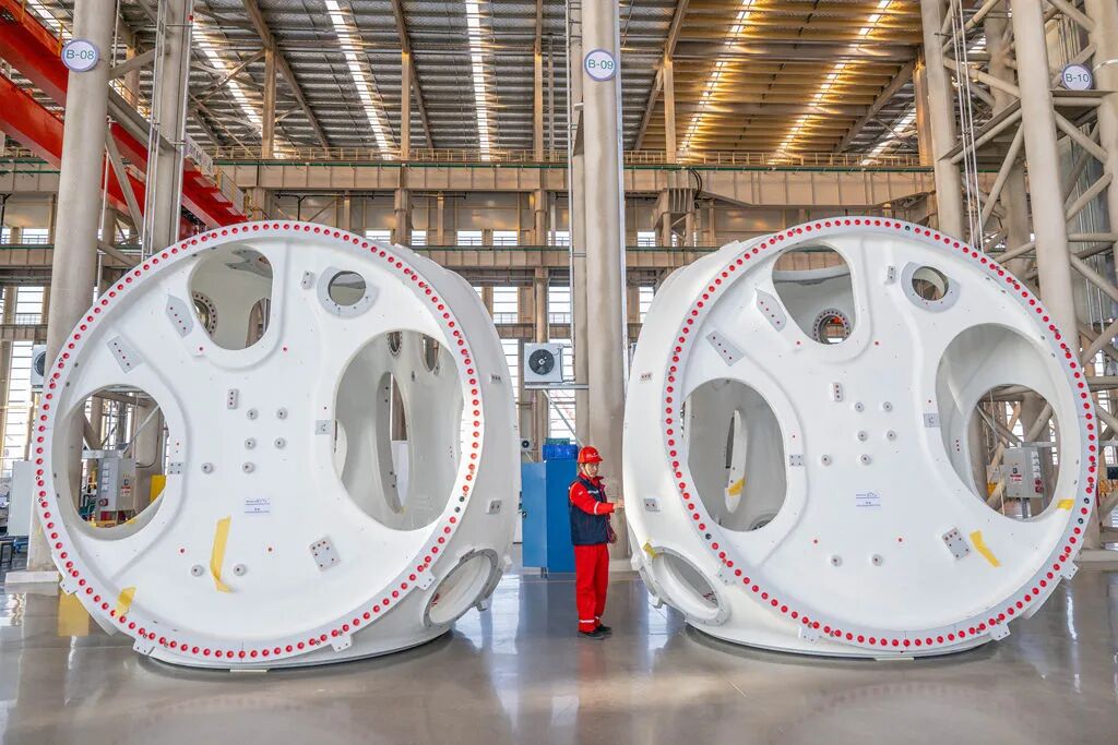 金風(fēng)科技秦皇島總裝廠內(nèi),工人專注于風(fēng)電機(jī)組的裝配工作,每一道工序都凝聚著精益求精的工匠精神。