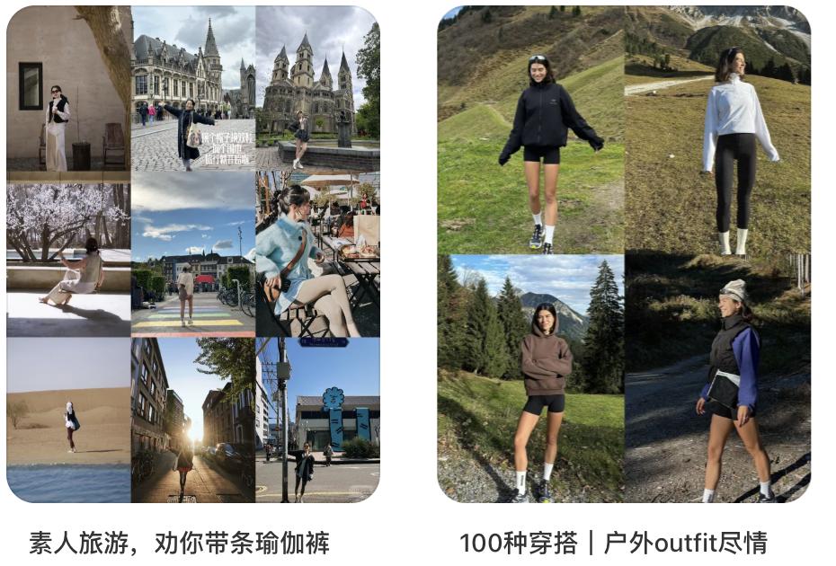 lululemon、Nike、adidas等品牌不僅售賣服裝,更持續(xù)輸出運動生活圖景。大量穿搭博主分享Citywalk運動風、旅行速干穿搭、「一周旅行一條運動褲」等內(nèi)容,讓運動服在視覺與敘事上更合理自然。