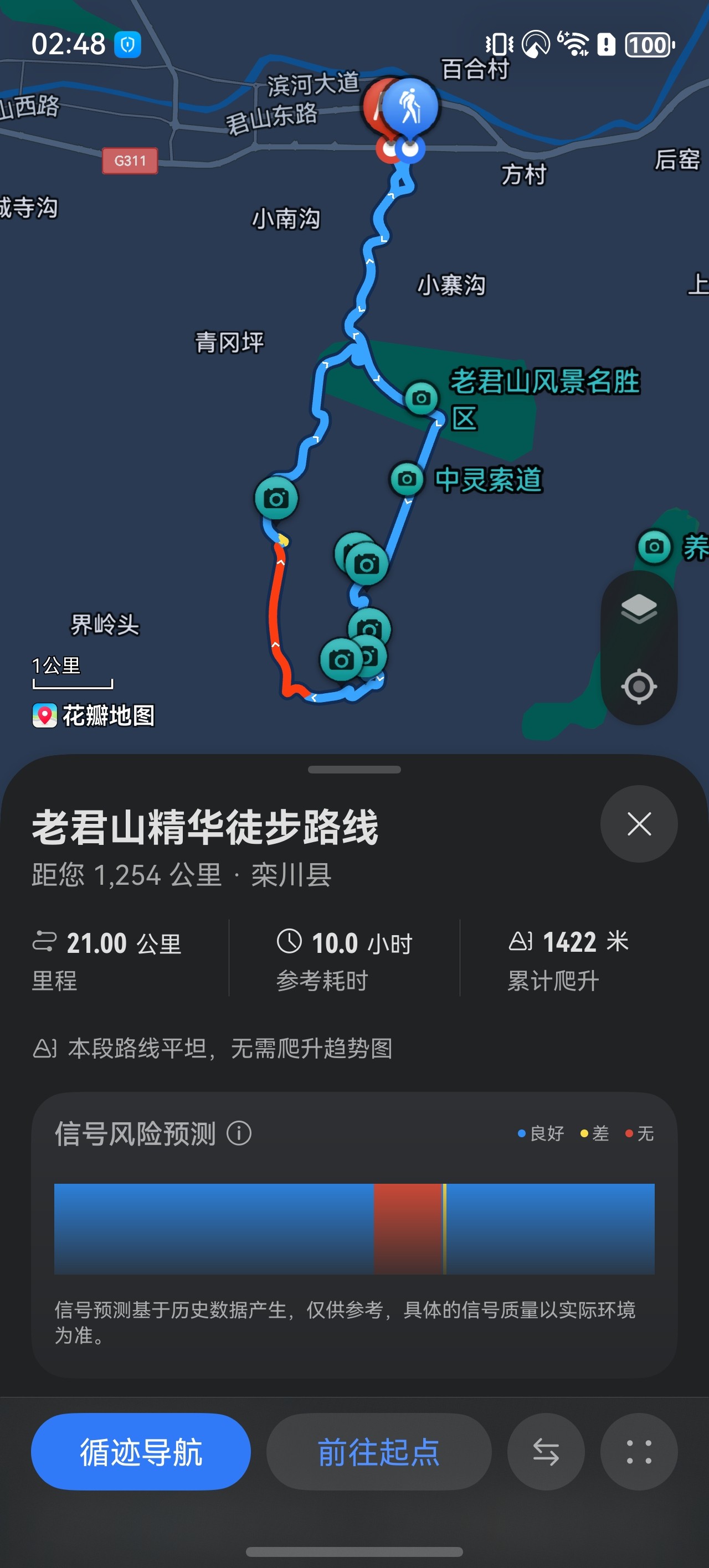 行進過程中,路線偏航和信號盲區(qū)風(fēng)險是長距離穿越時探索者的核心顧慮?;ò甑貓D的“循跡導(dǎo)航”通過智能提醒全程護航,當出現(xiàn)路線偏航、距里程碑達整數(shù)公里、進入無信號區(qū)域等關(guān)鍵節(jié)點,系統(tǒng)會自動觸發(fā)語音播報,幫助用戶實時掌握行程動態(tài),規(guī)避迷路風(fēng)險。配合業(yè)界首發(fā)的信號地圖功能,通過不同顏色直觀標注“信號良好/較差/無信號”區(qū)域,讓信號盲區(qū)“可視化”,方便用戶提前預(yù)判應(yīng)對。若需折返,用戶可隨時通過“原路返回”功能調(diào)取最近14天的軌跡記錄,從任意歷史軌跡點啟動返航,確保探索進退從容、全程可控。
