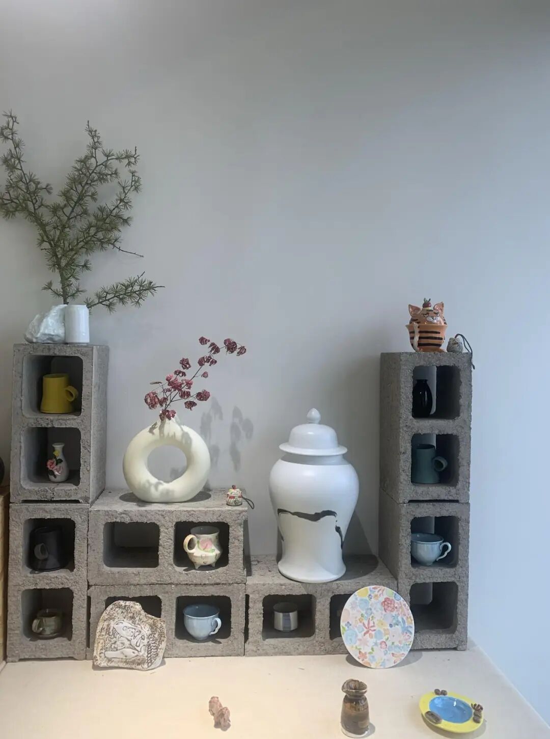 代班收尾任務是設計中庭展示墻。抱起第一塊空心磚,手心一沉——沒想到磚這么扎實。磚面粗糲磨掌心,我蹲地比劃:正放呆板,側放缺層次,留白多顯空……忽然閃過陶藝陳列案例,“展示”本身是空間美學實踐課。同伴們討論:“錯位堆留縫透光”“陶罐嵌縫互補”。我們錯落堆疊,空心磚的沉是做事的實在分量,素坯陶罐的輕是田野理想浪漫。陶土遇磚塊,輕重相濟間墻面煥發(fā)生機。午后陽光透過磚縫,素坯陶罐熠熠生輝,粗糲磚塊成了最好展臺。鄉(xiāng)村土地也一樣,樸素卻承載鮮活理想,慢生活與實日子相擁是最佳搭配。