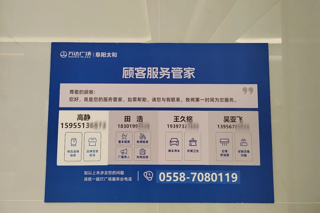 商場(chǎng)醒目位置張貼著“服務(wù)管家”公示牌,標(biāo)注了各區(qū)域、樓層服務(wù)管家的聯(lián)系方式,覆蓋咨詢、維修、租賃、尋車等場(chǎng)景,還補(bǔ)充了服務(wù)臺(tái)和投訴熱線。