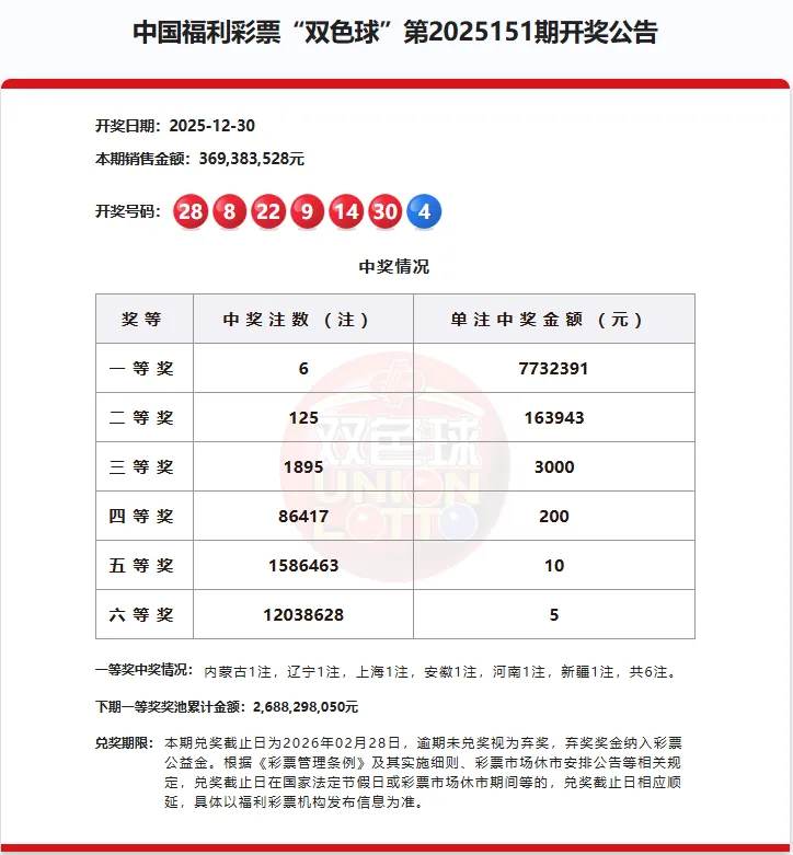 12月30日晚,中國(guó)福利彩票雙色球2025151期開獎(jiǎng)結(jié)果揭曉,當(dāng)期紅球號(hào)碼為08、09、14、22、28、30,藍(lán)球號(hào)碼為04。我市海勃灣區(qū)黃河西街錦馨園小區(qū)南門21-1的15030278號(hào)銷售站中出1注二等獎(jiǎng),獎(jiǎng)金總計(jì)163943元。