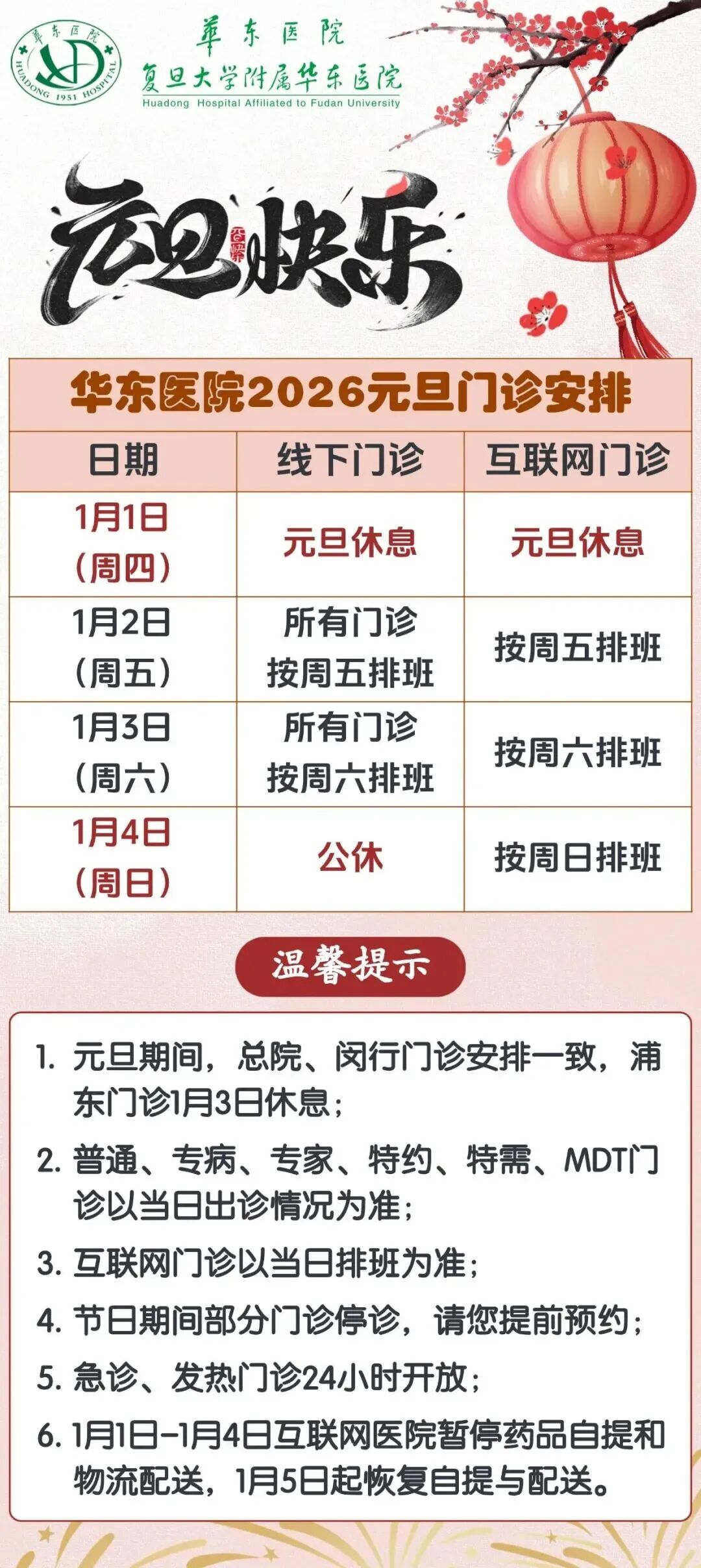 復旦大學附屬華山醫(yī)院:元旦期間各院區(qū)線下門診按指定時間開放,互聯(lián)網(wǎng)醫(yī)院24小時提供服務。