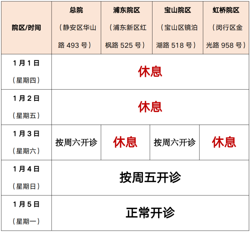 靜安區(qū)中心醫(yī)院:1月1日門診停診,1月2日按周日門診、1月3日按周六門診、1月4日按周五門診開放;假期內(nèi)急診、兒科24小時接診。