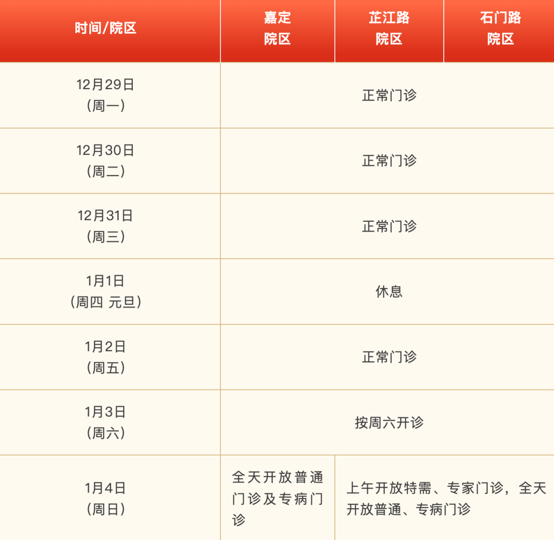 市北醫(yī)院:共和新路總院(共和新路4500號)1月1日—3日開設便民門診,體檢中心同期停診,1月4日門診開放;假期內(nèi)胸痛門診、口腔科開診,急診內(nèi)科、外科、骨科、婦科、發(fā)熱門診24小時接診,急診兒科每日8:00—21:00開放。聞喜路分部(聞喜路1152號)1月1日—3日門診停診,1月4日開診。