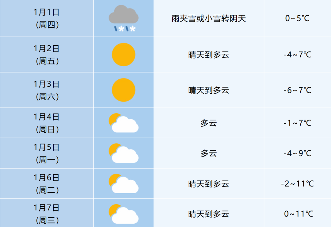 1月1日(周四):全省陰天,沿淮淮河以南大部分地區(qū)有雨夾雪或小雨,其中江淮之間東部部分地區(qū)和本省山區(qū)有小雪。
