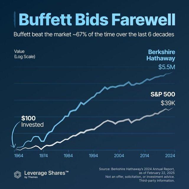 巴菲特留下了一份足以載入金融史冊(cè)的成績:從他執(zhí)掌伯克希爾開始,初始投資100美元的資金,以伯克希爾·哈撒韋A類股股價(jià)計(jì)算,已增長到約550萬美元,而同期標(biāo)普500指數(shù)的回報(bào)約為3.9萬美元。他管理的投資組合,有大約67%的時(shí)間表現(xiàn)超過市場(chǎng)基準(zhǔn)水平。