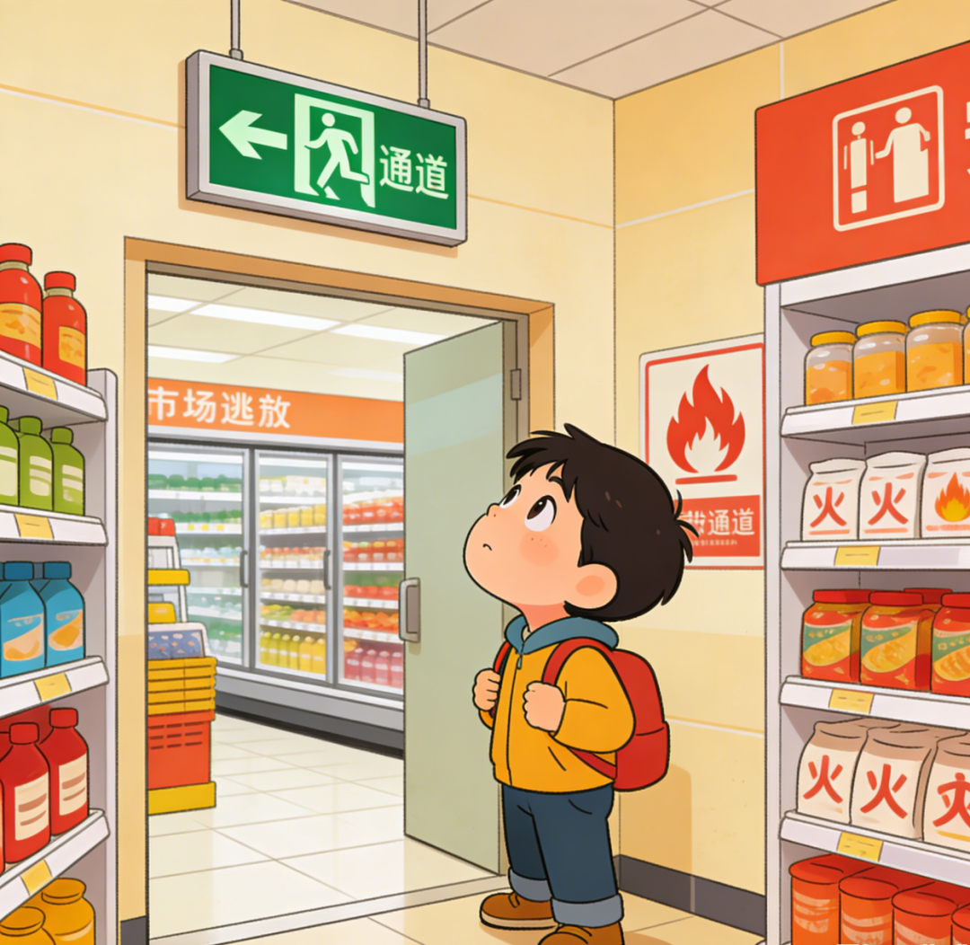 進(jìn)入超市、飯店、KTV等場所時,要留意并熟悉疏散通道和安全出口的位置,一旦發(fā)生火災(zāi),按照疏散指示標(biāo)識迅速有序逃生。