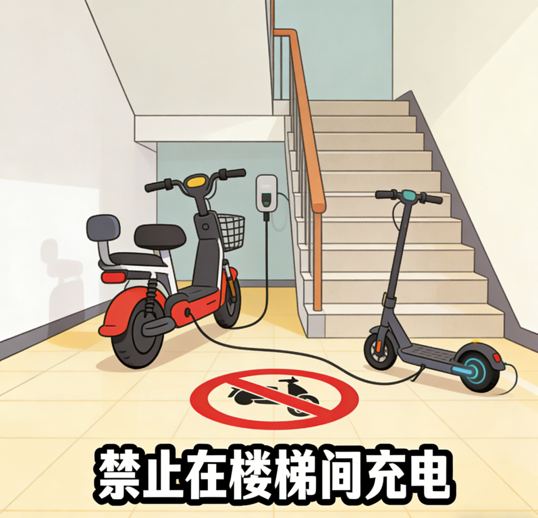 電動自行車嚴(yán)禁在建筑室內(nèi)、疏散通道、樓梯間、安全出口、門廳等區(qū)域停放或充電!不要將蓄電池帶回家中充電!切勿在消防車通道堆放雜物、停放車輛,保持消防車通道暢通。