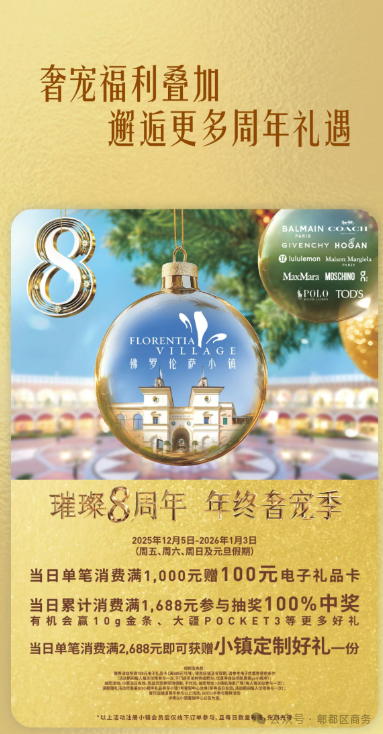新年購(gòu)物狂歡已開(kāi)啟!成都佛羅倫薩小鎮(zhèn)8周年慶同步拉開(kāi)新年購(gòu)物季序幕,“年終奢寵季”主題活動(dòng)持續(xù)進(jìn)行,為你帶來(lái)冬日的快樂(lè)與驚喜!