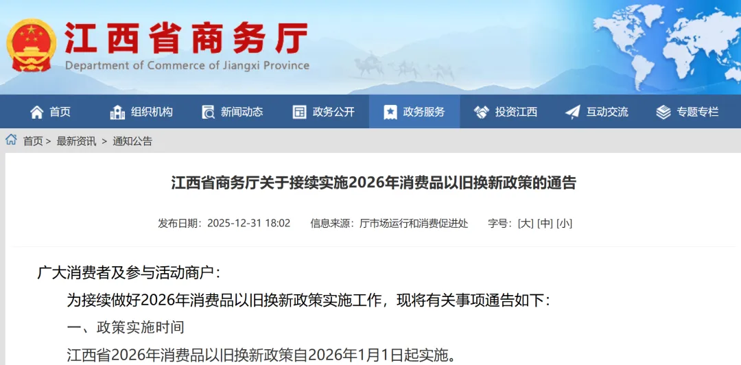 2026年1月1日起,江西省正式接續(xù)實施消費品以舊換新政策,旨在進一步激發(fā)消費潛力,推動綠色低碳循環(huán)發(fā)展。該政策覆蓋汽車、家電、數(shù)碼智能產(chǎn)品等多個品類,通過財政補貼鼓勵消費者淘汰舊品、購置新品,釋放內(nèi)需活力。
