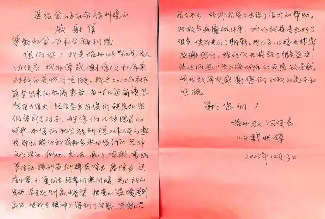 為了讓關(guān)懷更持久、有依托,金山區(qū)社會(huì)福利院與梅州新村居委會(huì)正式簽訂結(jié)對(duì)幫扶協(xié)議。一紙約定,是一份鄭重的承諾。從那天起,福利院與回阿姨長(zhǎng)達(dá)十三年的陪伴,悄然開(kāi)始。
