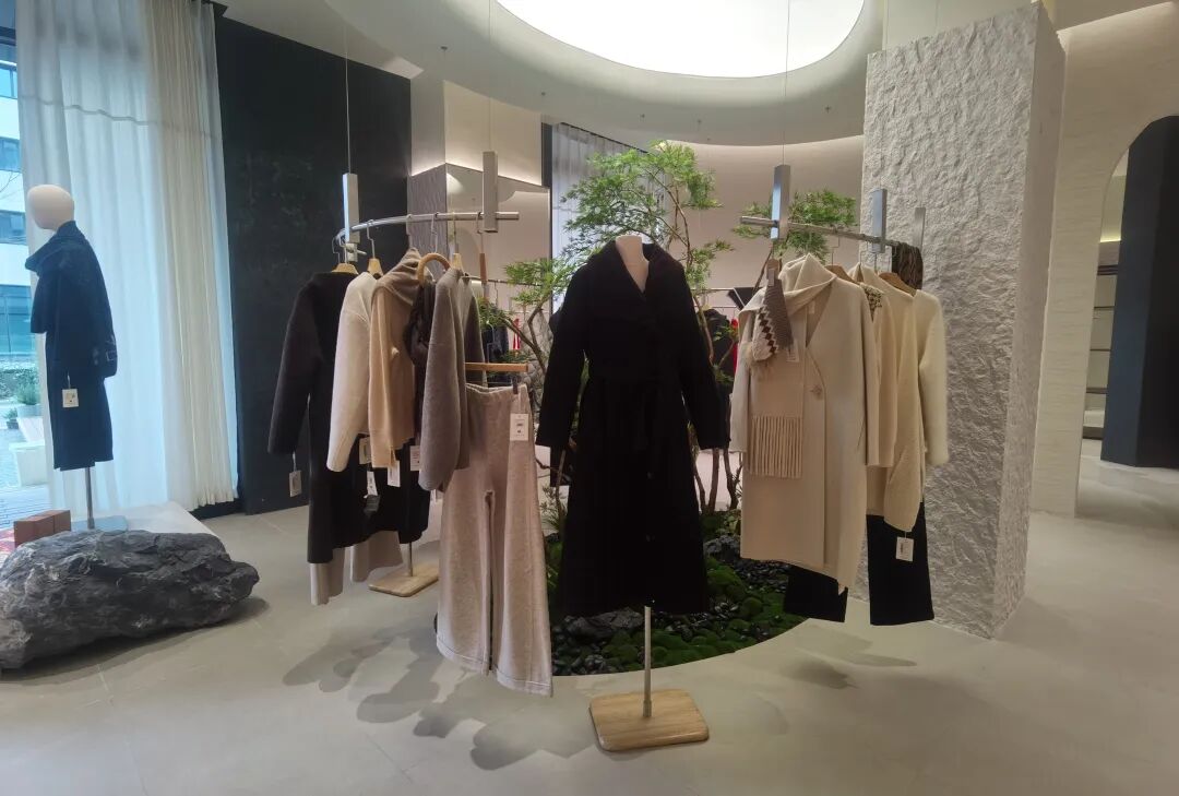 這家零號店坐落于松江G60數(shù)字光谷·波匯7號樓的首層,近一千平方米的空間里陳列著超過一千五百款服裝,價格從兩百元到六千元不等,可滿足不同消費群體的多樣化需求。店內(nèi)推出了多個特色系列,像非遺高定系列、匈牙利白鵝絨羽絨服系列、羊絨大衣系列、新年·圣誕風(fēng)系列、真絲羊毛羊絨打底衫系列以及牦牛絨褲裝系列。