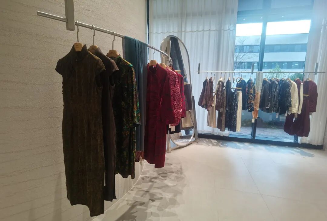 品牌主理人許善芝介紹,服裝生產(chǎn)車間就在展廳樓上,所有產(chǎn)品能直接從車間送到顧客手中,高定區(qū)域的旗袍等服裝還可以為顧客量身定制。店內(nèi)配備了擁有八年以上工作經(jīng)驗的專業(yè)導(dǎo)購人員,能為顧客提供專業(yè)的穿搭建議。