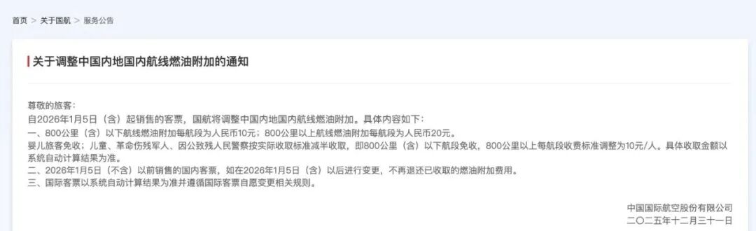 2026年1月5日起國內(nèi)航線燃油附加費下調(diào) 三大航司同步調(diào)整收費標準