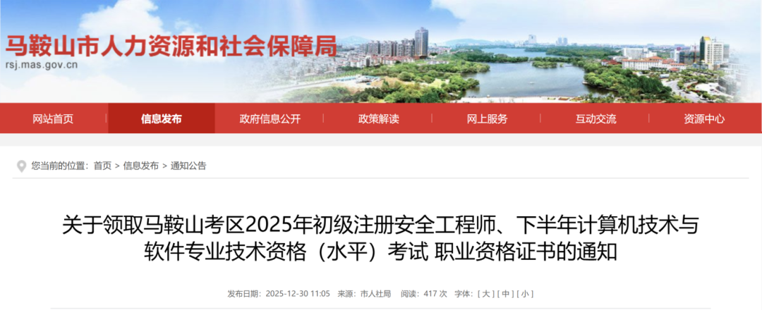 近日,市人社局發(fā)布了關于馬鞍山考區(qū)2025年初級注冊安全工程師以及下半年計算機技術與軟件專業(yè)技術資格(水平)考試職業(yè)資格證書領取的通知。