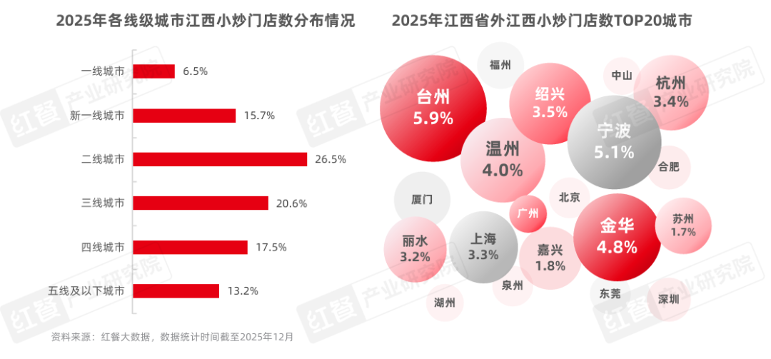 從城市線級(jí)分布來(lái)看,江西小炒在下沉市場(chǎng)有很強(qiáng)的滲透力。根據(jù)紅餐大數(shù)據(jù),二線城市的江西小炒門(mén)店數(shù)量占比最高,達(dá)到了26.5%;三線城市緊隨其后,占比超過(guò)20%;新一線城市、四線城市、五線及以下城市的占比都在10%以上。值得注意的是,在江西省以外的江西小炒門(mén)店數(shù)排名前20的城市中,浙江省轄區(qū)內(nèi)的城市占了將近一半,而且排名都比較靠前,像臺(tái)州、寧波、金華、溫州、紹興等。