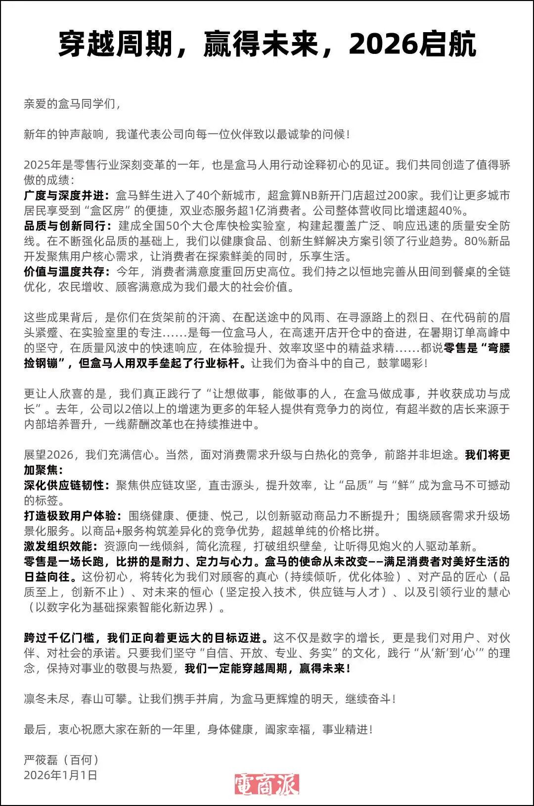 2026年元旦,盒馬CEO嚴(yán)筱磊的新年全員信在零售圈受到廣泛關(guān)注:2025年盒馬整體營(yíng)收同比增長(zhǎng)超40%,盒馬鮮生與超盒算NB兩大業(yè)態(tài)服務(wù)用戶超1億。