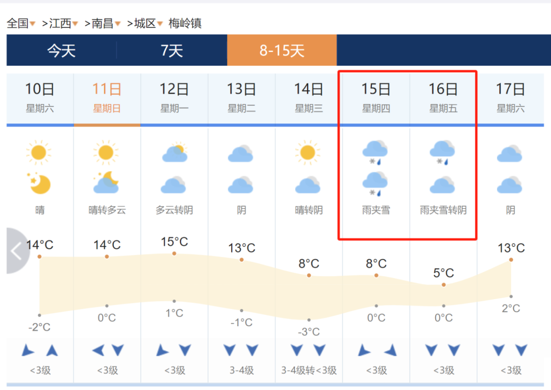 此外,中央氣象臺(tái)預(yù)測,南昌梅嶺在15日至16日將出現(xiàn)連續(xù)兩天的雨夾雪天氣。