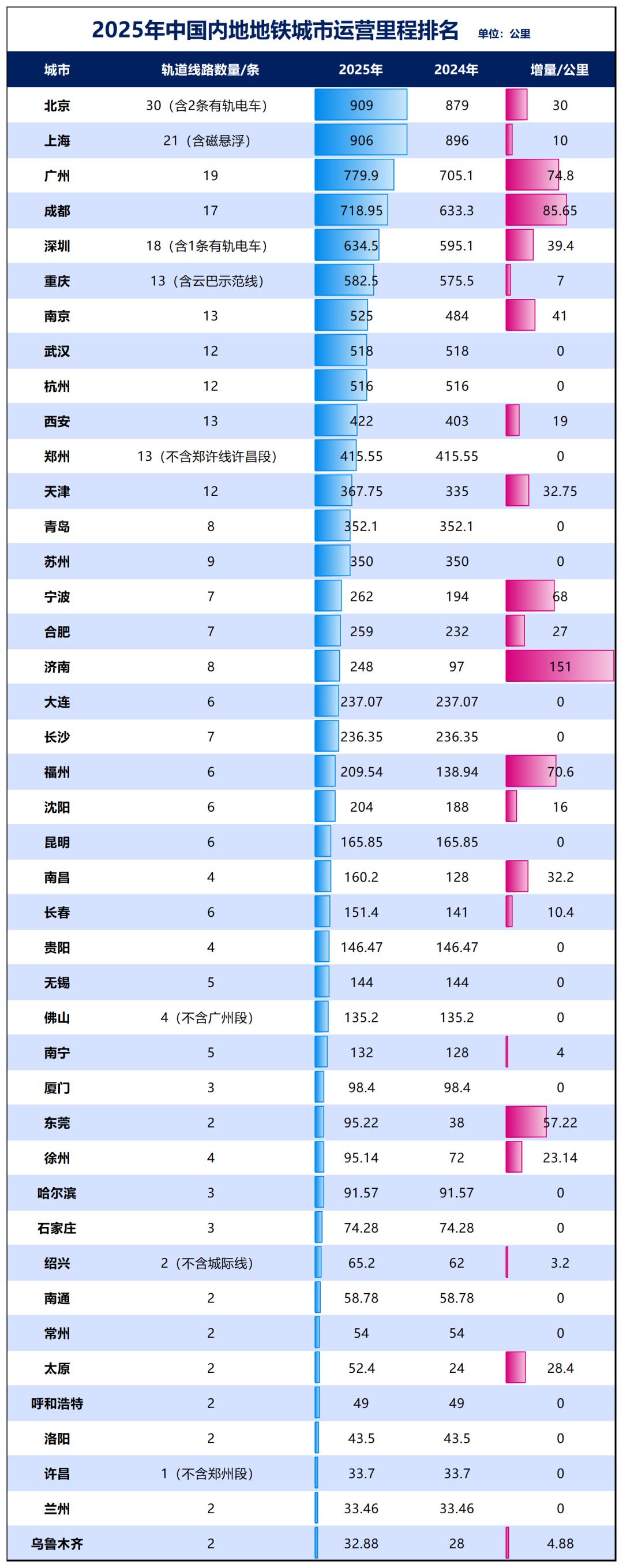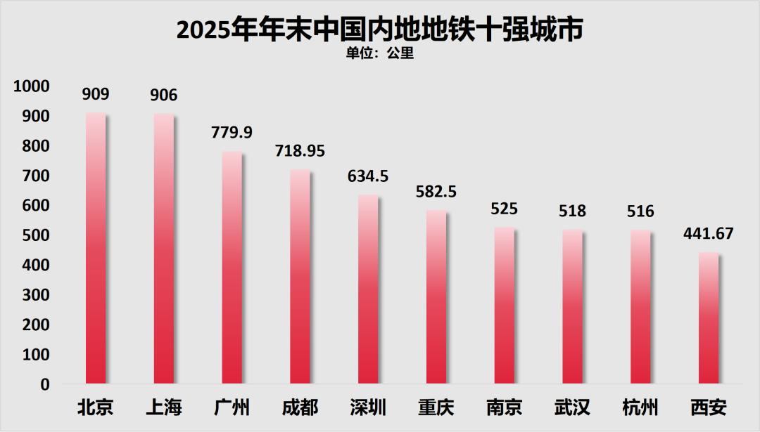 2025年末地鐵十強(qiáng)城市依次為北京、上海、廣州、成都、深圳、重慶、南京、武漢、杭州、西安。