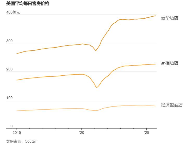 安保成本上漲轉(zhuǎn)嫁消費(fèi)者,形成酒店價(jià)格分層。華爾街日?qǐng)?bào)報(bào)道,美國(guó)豪華酒店日均房?jī)r(jià)達(dá)394美元,比次一級(jí)高168美元,差距創(chuàng)歷史新高。