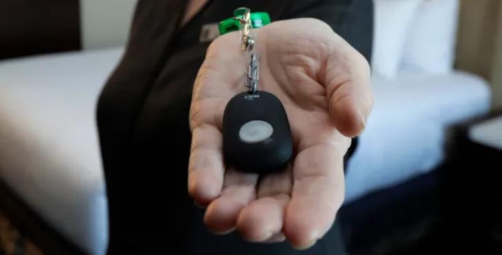 退房時(shí),我注意到Lin領(lǐng)口的黑色方塊——恐慌按鈕,洛杉磯酒店業(yè)強(qiáng)制標(biāo)配,按下可聯(lián)動(dòng)保安中心和警局。Lin說(shuō)曾因大堂揮槍、翻越柜臺(tái)按過(guò)兩次,這是她的“安全氣囊”。