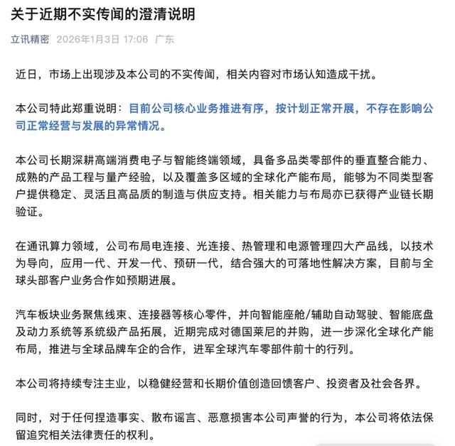 2026年1月3日晚間,消費電子行業(yè)領(lǐng)軍企業(yè)立訊精密通過其官方微信公眾號發(fā)布了《關(guān)于近期不實傳聞的澄清說明》,針對市場上出現(xiàn)的相關(guān)謠言進行了正式回應(yīng)。